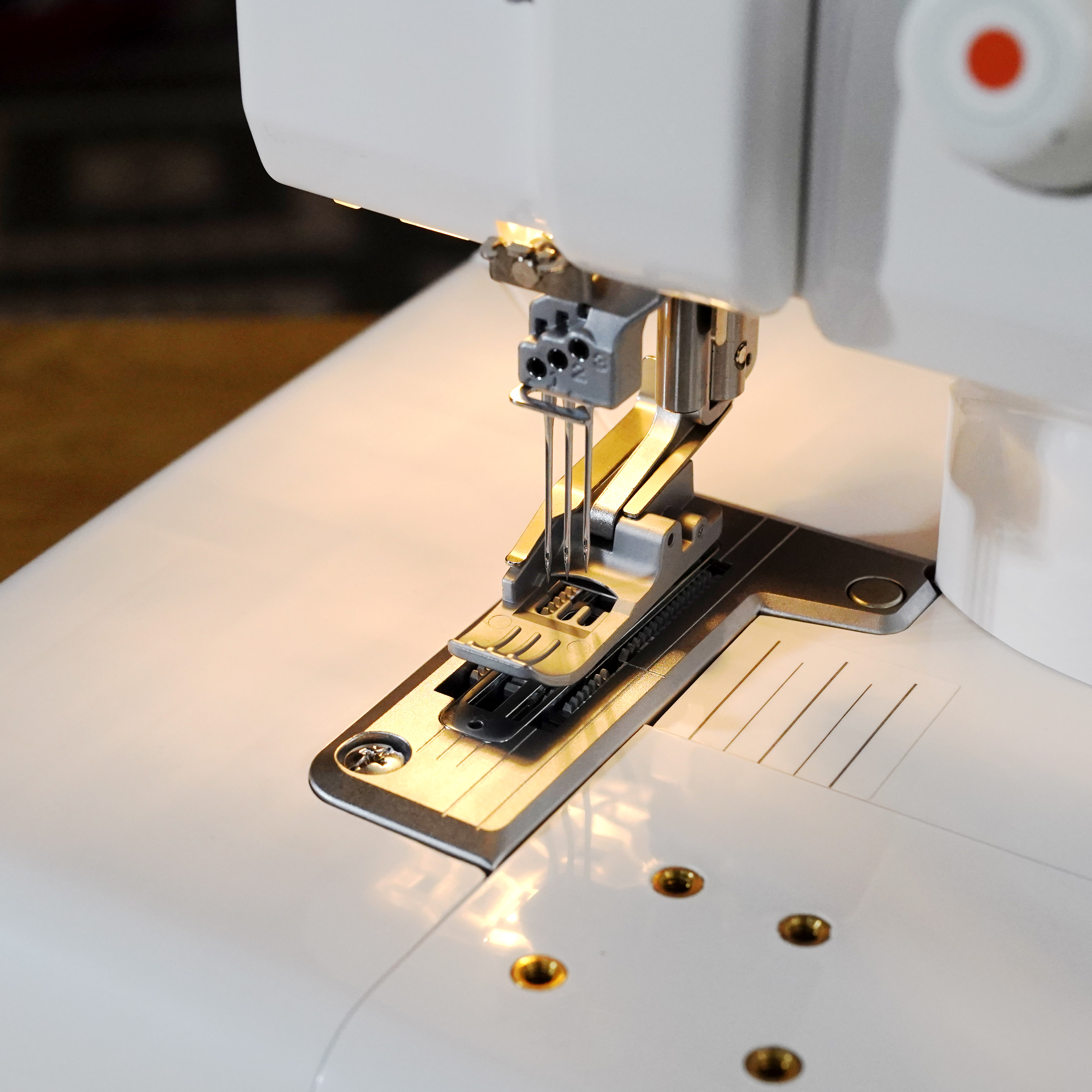 This machine offers versatile stitch options, including wide and narrow 3-thread cover stitches, a strong 4-thread stitch and a double chain stitch for extra stability or decorative effects. Manual tension adjustment ensures precision on different fabrics, while the automatic lowering feed dogs make inserting and removing material smooth, even when handling thick seams or layered projects.