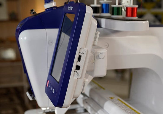 Send your own designs to the machine from either a memory stick or your computer, using the two USB ports. The large 7-inch colour LCD touchscreen lets you select, edit, add text and position designs with on-screen setup guides to help you through each step. An LED needle pointer shows exact needle placement before you stitch, taking the guesswork out of design positioning. The independent bobbin winder lets you prepare bobbins while the machine embroiders and a sensor alerts you when thread runs low. The front-loading vertical bobbin system gives you access to check thread levels without removing your hoop or disrupting your project mid-run.