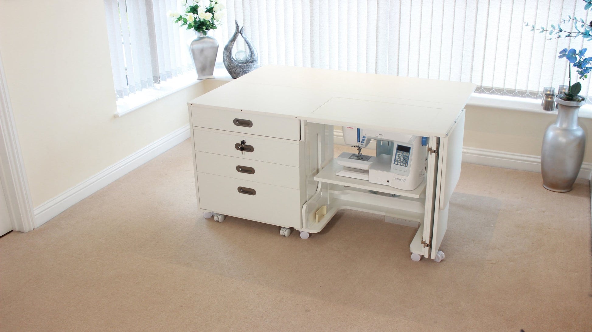 - Extendable side and rear work areas Supported by sturdy legs and door supports for a large, stable sewing surface.