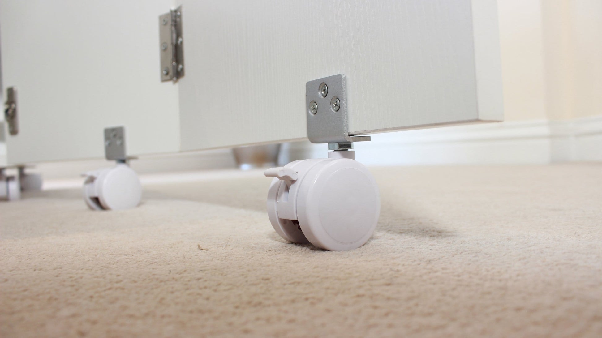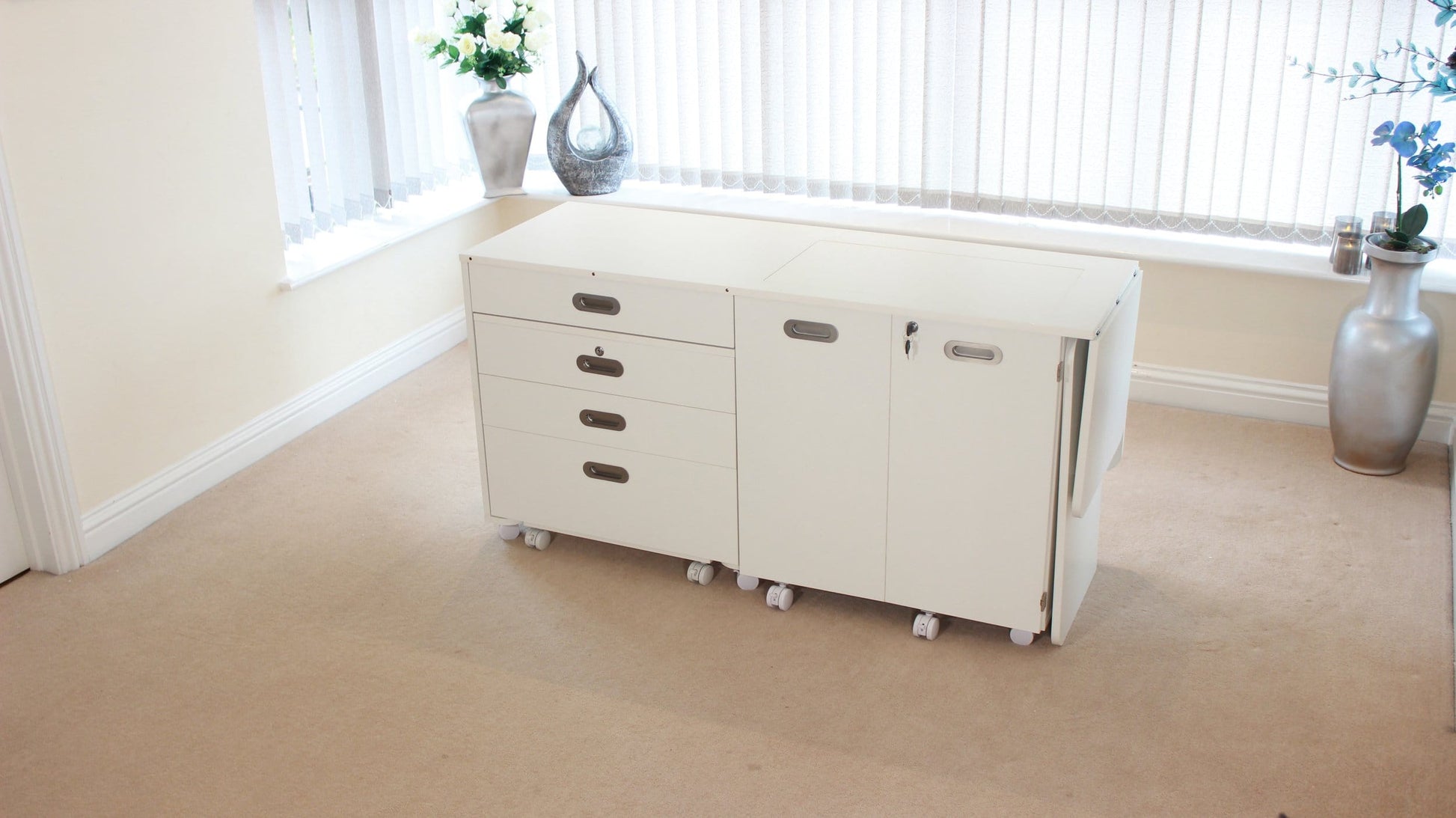 To the left sits a mobile drawer unit with a lockable top drawer and an extension piece that sits on top to expand your workspace. A slot‑in filler piece can be added above the drawer for extra supported surface area or removed to create more seating room.