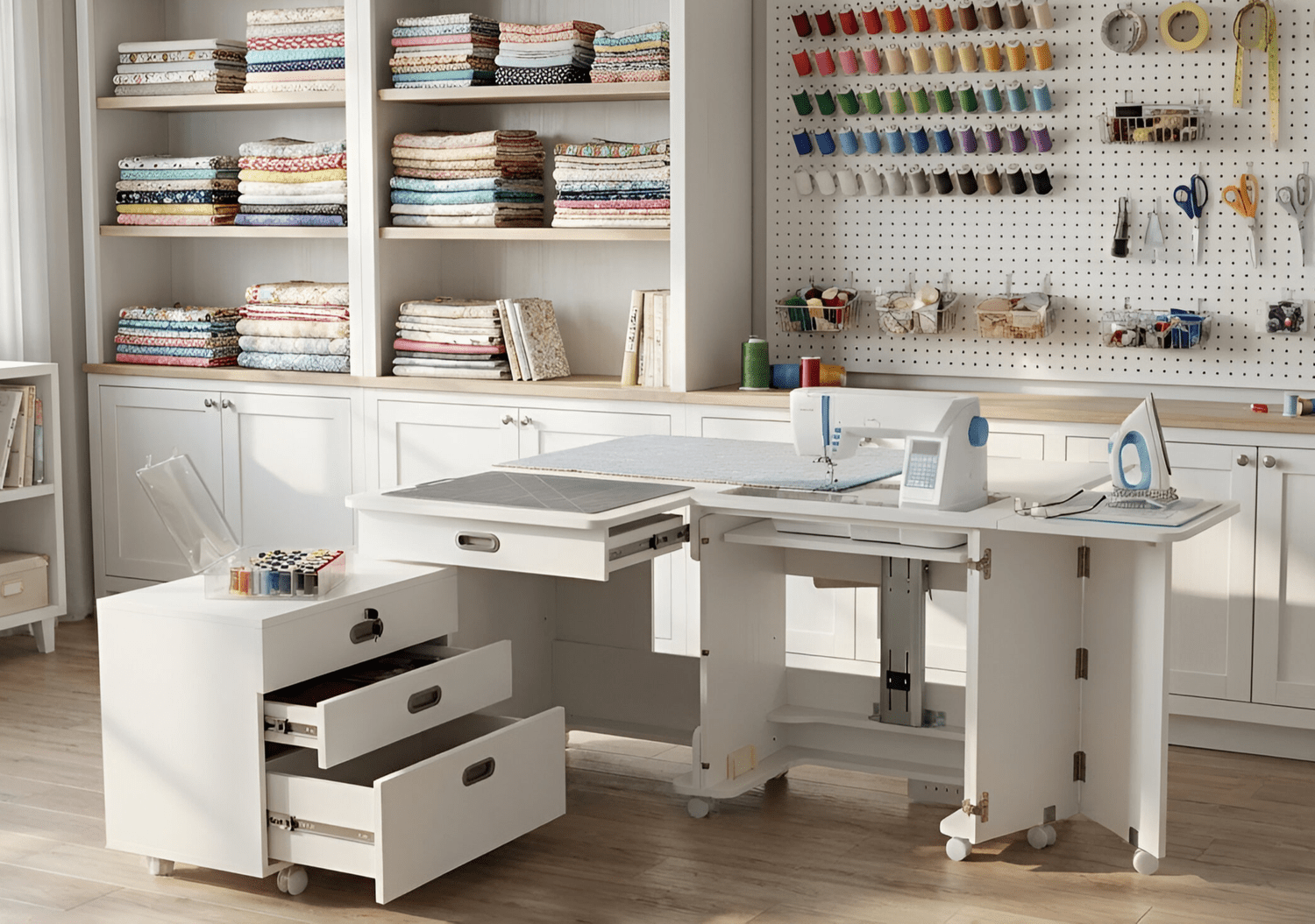 - Slot‑in filler panel above the machine Creates a large cutting or prep surface when the machine is stored away.
